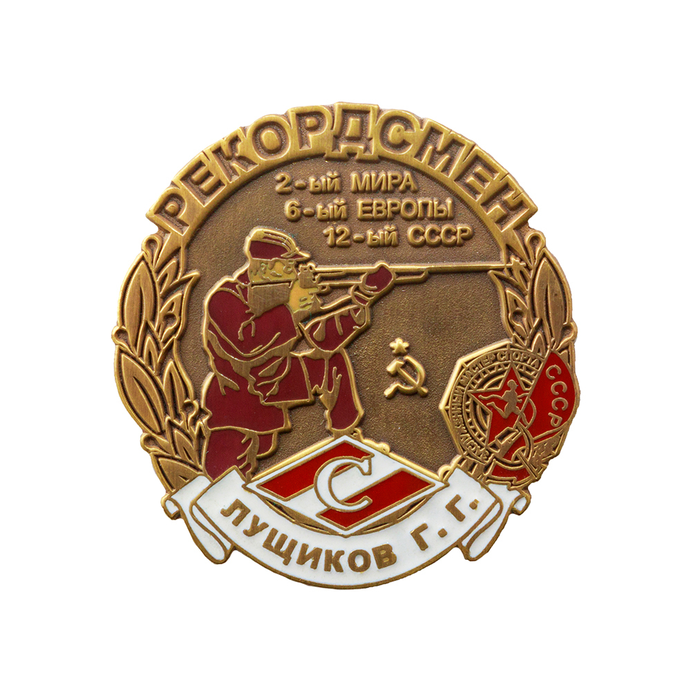 Значок "Рекордсмен Геннадий Лущиков". Геннадий Лущиков - пулевая стрельба, Бронзовый призер Олимпийских игр 1976, Чемпион мира, Европы и СССР, заслуженный мастер спорта.